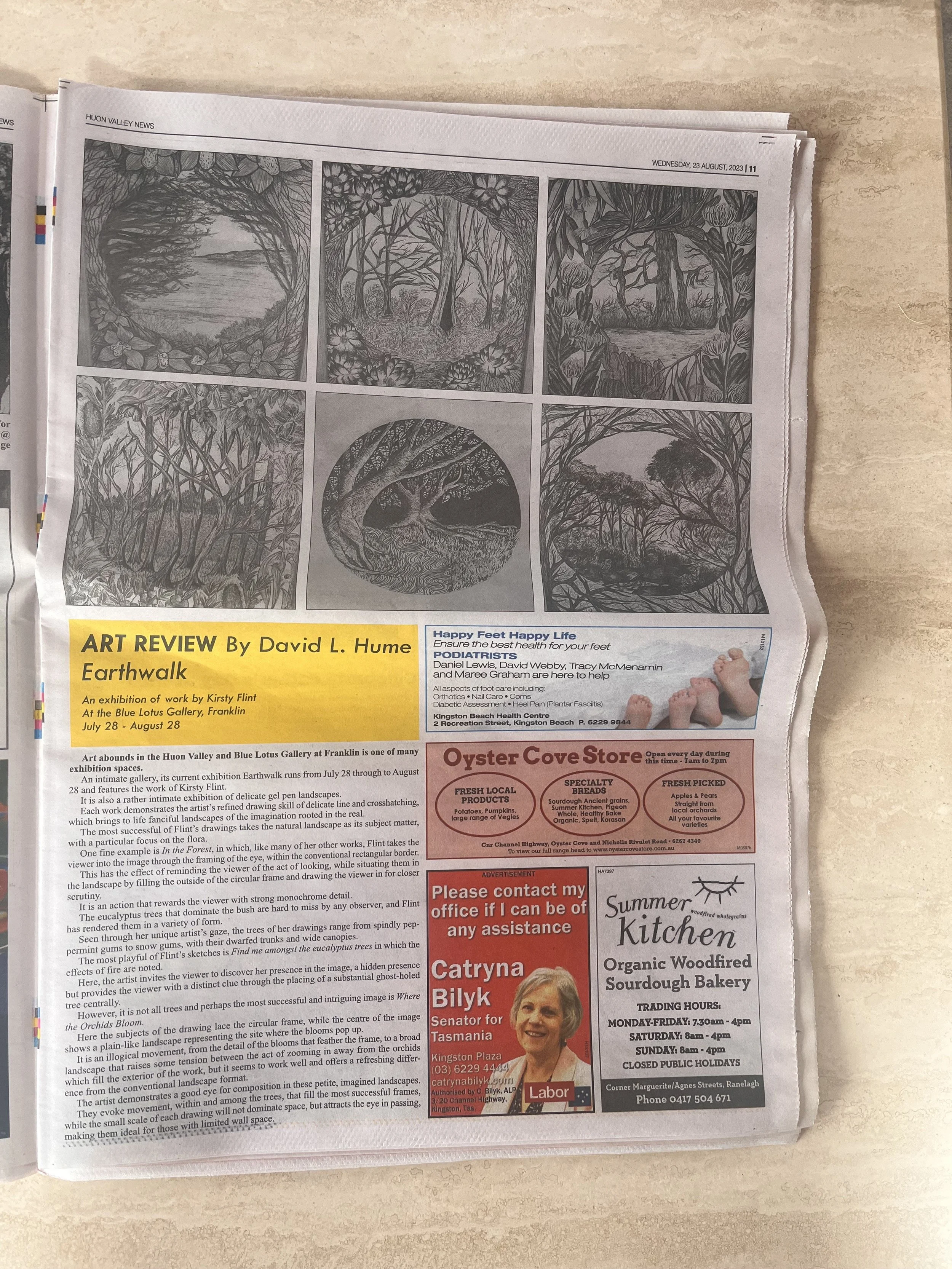 My exhibition EARTHWALK was reviewed by David L. Hume in the local Huon News, where he published a short review of my work.